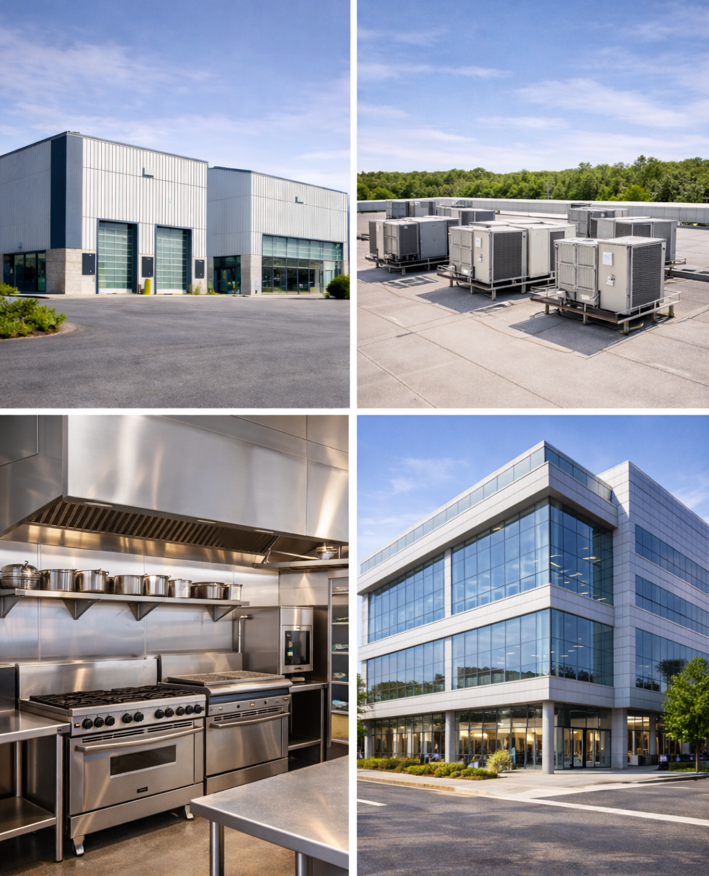 Commercial inspections customized for office buildings and corporate complexes, retail centers and plazas, industrial warehouses and factories, hotels, motels, and hospitality properties, multi-unit residential buildings